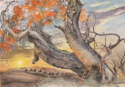 這種植物在鄂南大地隨處可見,但是像毛才奇老師筆下那種古樸、蒼老、怪異的不多。從毛才奇老師畫中可以看出,他筆下的楓楊多長在水溝旁、亂石中。