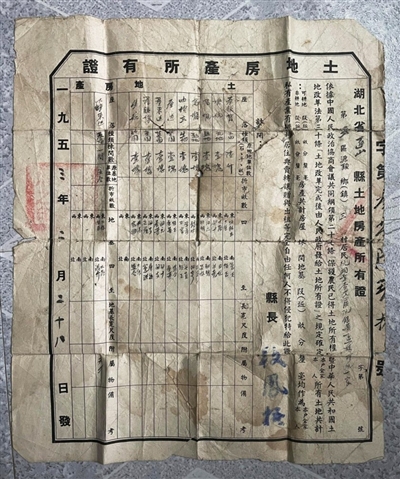 這張通山縣人民政府在1953年頒發(fā)的“土地房產(chǎn)所有證”雖然早已失效,但該證記載了新中國保護土地的歷史進程,是中國共產(chǎn)黨領(lǐng)導(dǎo)廣大貧苦農(nóng)民進行土地革命、廢除封建土地制度、翻身當(dāng)家做主人的歷史見證,具有很高的歷史價值。