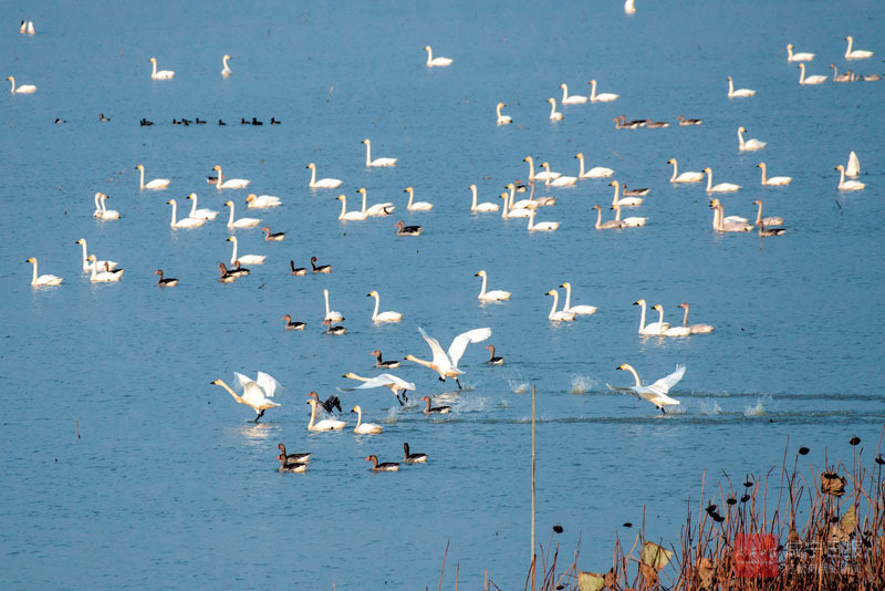 11月12日,赤壁市余家橋鄉(xiāng)東港湖,數(shù)萬只天鵝、大雁等候鳥在濕地里嬉戲、覓食。
