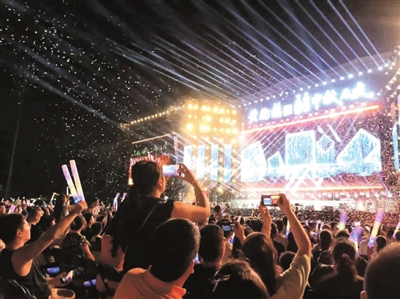 “我和我的祖國,一刻也不能分割……”10月1日晚,月亮灣街區音樂節現場,萬人齊唱《我和我的祖國》,紅旗與熒光棒交織成紅色海洋。