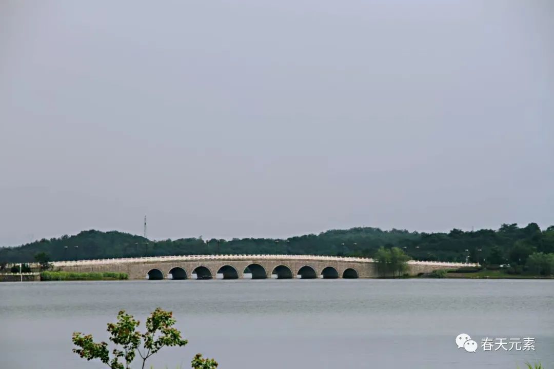 東邊,緊鄰現(xiàn)代房屋建筑群,有一個精致的9孔拱橋,銀灰色,像一條細長的風干銀魚,玲瓏秀美。該橋如處女般平躺靜臥,恰到好處地將湖面攔腰隔斷。橋的一頭連著現(xiàn)代派小區(qū),一頭插入青山綠水,用最直接的方式將山水與城市對接,打開了城市文明與原始山水之間的通道。