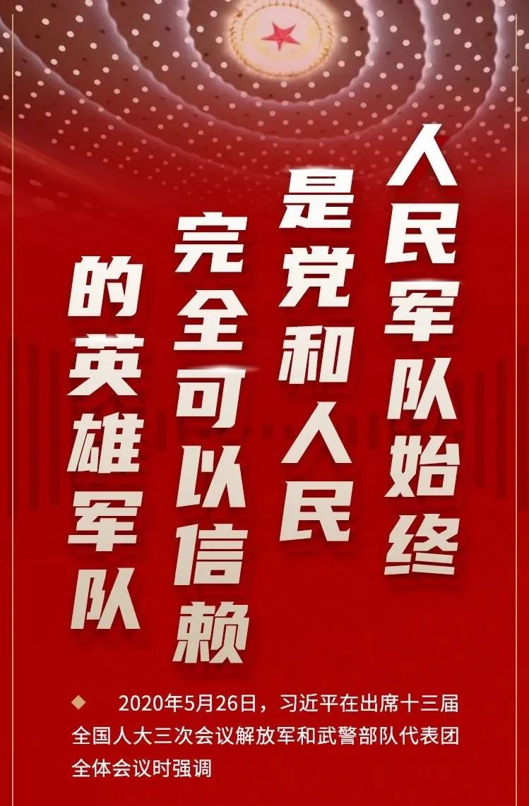 壯哉人民軍隊,偉哉人民軍隊!不忘來時路,走好新長征。有靈魂、有本事、有血性、有品德,做新時代革命軍人;銘初心、擔使命、民擁軍、軍愛民,結新時代魚水深情。人民軍隊,國之長城;強軍強國,百年夢想;人若犯我,必射天狼!
