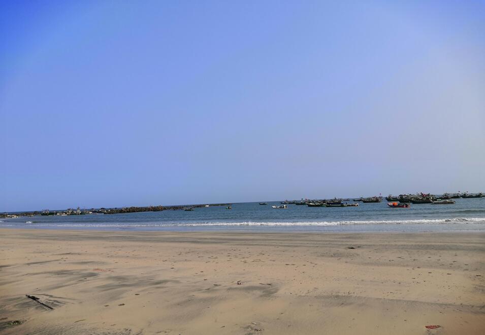 這里的波濤經過前面一圈礁石的阻擋后,打在沙灘上并沒有文人描寫的那樣洶涌澎湃,而是輕柔曼妙。泛著白色的海浪輕輕沖擊沙灘,盡最大能力地往沙灘遠處延伸,然后又緩緩地退回到海里,帶走了我的腳印,磨平了沙灘的創傷。我們赤腳走在沙灘上,任海浪輕揉地拍打,任海風輕輕迎面吹拂,讓這涼爽爽的風浪沖走炎熱的白天帶來的沉悶心情。眺望大海,目光所及的盡頭,時不時地閃著點點漁火似的燈光,那是天邊的游子歸來的點點信號?!