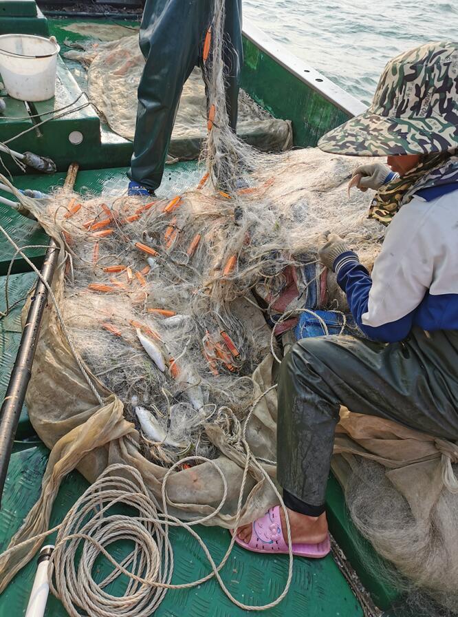 安頓下來后,有人提議出海打魚,自行解決晚餐問題。在我們的一再要求下,老鄧夫婦答應跟我們一起出海。說是出海打魚,其實是老鄧夫婦倆打魚,我們坐在漁船里觀賞而已。老鄧駕船,女主人熟練地將標有醒目印記的漁網依次拋向大海,一圈下來,收獲滿滿,都是各種小海鮮,就在海浪將我們搖曳得快暈船的時候,我們收工回家。