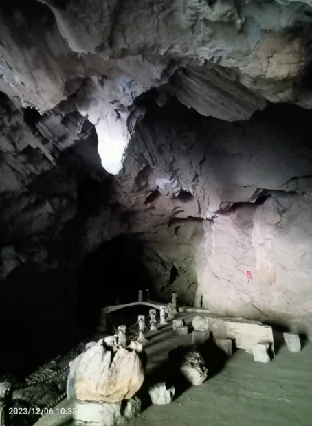 既來之,我們自然要入洞一探究竟。于是,申鳴、華清上前,我和國慶隨后,欣然入洞細看。所到之處,干濕度的確偏干,除少許洞頂有滴水的段位外,余處均無濕潤痕跡。平生見過些石窟和山洞,橫向這么深的干洞我還是頭一次看到。在華清的提示下,我們看到洞壁上有一道道平行的流水留下的水紋。沿干砂和頁巖相間、由外向里略微下傾的崎嶇地面往里探尋,大約近四百米算是探到了盡頭。只見洞身呈“7”型下拐,“7”字的地下部分是暫未開發也無法測量的水潭。試想水潭與背面的陸水湖相通,陸水湖漲水時節,水潭的水流增大,便經洞口流向洞外的赤馬港。當陸水湖水位下降到洞內地平面以下,這巖洞自然就成了干洞。