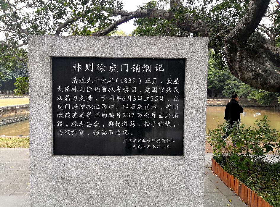 真正的銷煙池在進門不遠的左側,分別為兩個長寬為50米左右的正方形水池,池不深,大概一米左右,岸邊綠樹掩映,其中一棵巨大的榕樹樹葉幾乎遮住了半個池子。盡管已有近兩百年的歷史了,但由于維護得當,一直保持著原貎。正是當年這兩個不怎么顯眼的煙池,上下翻騰的鹵水煎熬的不僅是收繳來的鴉片,同時還有日薄西山的滿清政府。