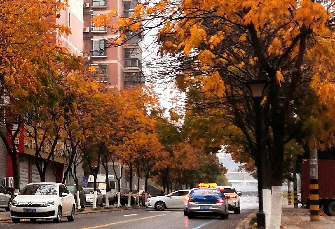 然而,我最喜歡的還是深秋的無患子,那是它一年中最靚麗最耀眼的高光時刻。此時的無患子,樹葉由橙黃變成桔紅,最后變身金黃,美得讓人心醉留連。抬眼望去,金黃與深紅、橙黃交織在一起,宛如打翻了調(diào)色盤,斑斕的色彩淹沒了整條道路以及過往的行人和車輛。