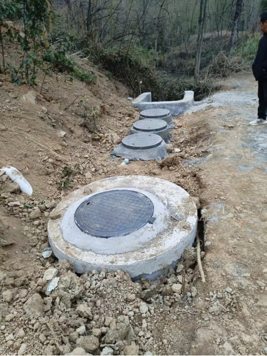 污水處理是個相對繁瑣的工程,先要像省略號一樣在地下埋設一大三小四個水缸粗、屋脊高的水泥筒,水泥筒頂端均以水管橫向連接,農民住房的生活污水排到第一個類似化糞池的大號水泥筒,筒里污水沉甸腐化后,濁氣從預置在頂蓋上的排氣管釋放,液體則通過連接管流向下一個水泥筒,如此循環到第四個水泥筒后,筒內流出的液體再經過三道凈化閥排到路旁低凹地。環顧全灣,我們看到二組路旁分別擺放著黑、紅、藍、綠四只垃圾桶,可見這組的垃圾已實行了按其它垃圾、有害垃圾、可回收垃圾和廚余垃圾類別分類投放。