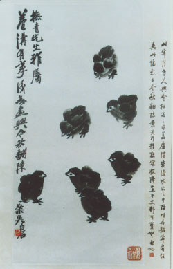 數年前,國畫大師齊白石先生的家屬向中國人民抗日戰爭紀念館捐獻了一幅名為《七雞圖》的水墨畫,《七雞圖》為白石老人生前親筆所畫,畫面上七只小雞栩栩如生,畫的左側有白石老人的題款“撫青先生雅屬:盧溝有事后無畫興,今秋翻陳案矣。白石”,右側是啟功先生的題跋:“此寄萍老人興會極高之作,蓋盧溝變后,水火之中,雖時弄翰,寧有佳興。此幅題云今秋翻陳案矣,乃指敵寇投降,畫中史料可實也”。