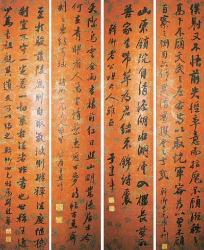“四條屏”是中國書法常見的表現形式。筆者所見王拯等人行書四屏以手繪蠟箋紙(規格均為167 厘米×35厘米)書室,墨跡至今仍烏黑,且光亮平滑。書家均以行書書寫,行筆流暢,既各呈風格,又同顯儒雅風致。