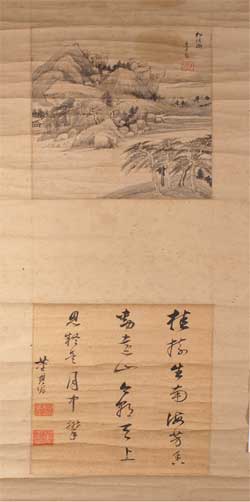 陜西省華陰市西岳廟文物管理處收藏了一件明代畫家董其昌繪制的山水畫——《松溪圖》。該圖原為清代道光、咸豐兩朝重臣華陰人李僡所珍藏,20世紀50年代李僡后裔捐贈給當時華陰縣文化館,現歸西岳廟收藏。此畫為紙本水墨畫,立軸,分兩部分,上為畫面,下為題詩。大小相若,均高30.5厘米,寬24厘米。經觀察,屬一失散的冊頁,后被裝裱成立軸。畫面右上側題有“松溪圖 玄宰畫”六字,下鈐有陽刻篆書朱文“昌”印,長0.30厘米,寬0.30厘米。下方詩堂題有行草書五言詩:“桂樹生南海,芳香勁遠山。今朝天上見,疑是月中攀?!弊髠嚷淇睢岸洳?,下鈐兩方陰刻篆書白文?。阂环綖椤白诓畬W士”,長0.38厘米,寬0.38厘米;另一方為“董氏玄宰”,長0.44厘米,寬0.44厘米。1994年夏,經故宮博物院書畫鑒定家劉九庵、楊臣彬先生鑒定,陜西省文物鑒定委員會鑒定,《松溪圖》為董其昌的真跡。