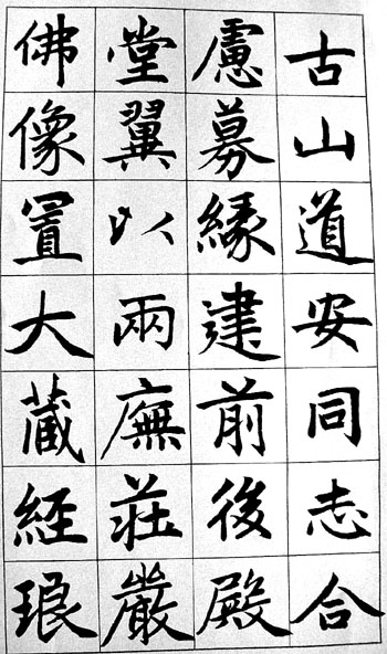 如右圖,元朝大書法家趙孟兆頁楷書,行筆流暢,一氣呵成,作者充分運用毛筆筆端的柔性,時時運動提按,如一位太極拳高手運氣一般,筆畫之間總感覺一股貫通之氣,使讀者看了不覺疲勞。(盧方祥)