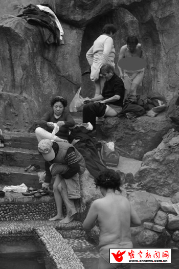 我循著霧氣向泉眼走近,說笑聲伴著熱浪襲來,沿著臺階走到假山背面,一處天然溫泉池映入眼簾。不大的池子里人頭攢動,清一色的爺們兒,赤條條的在池子各處。濃濃的霧氣罩住整個溫泉池,人影若隱若現。男人們泡在水里,有的在幫同伴搓背;有的靠在鵝卵石鋪就的隔欄上休息;有的泡好后穿完衣服的就在一旁的石凳上歇息。水上的和水下的相互招呼著,聊家常,講笑話,快樂就是這么不經意。