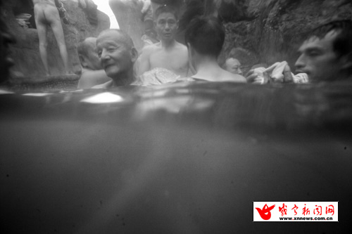 淦河月亮灣旁,熱氣騰騰的溫泉池子被假山環(huán)抱,女人們享受著露天溫泉。