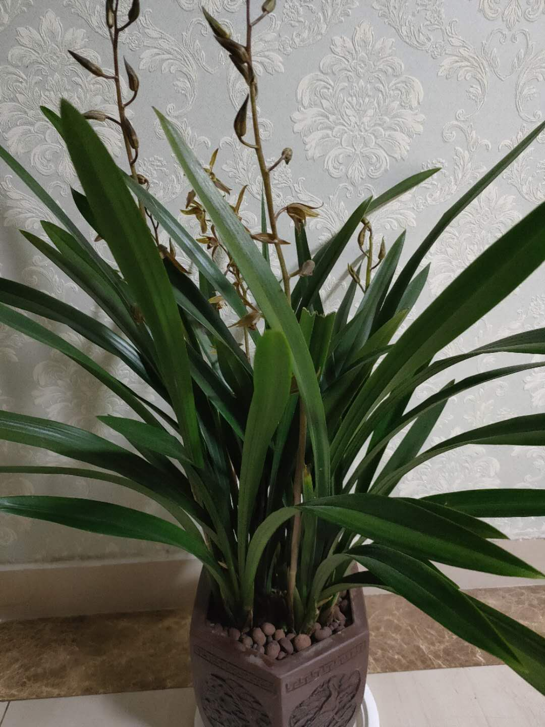 我有一盆墨蘭,2月22日就開了。新冠疫情期間,觀賞這盆墨蘭是每日的必修課。一株墨蘭競競伸出花莖,又一株競競吐蕊……小小的花盆里,五株墨蘭競相綻放。