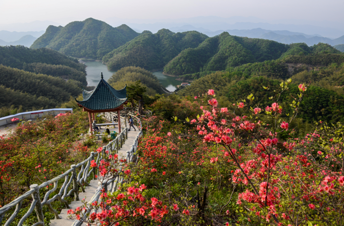 清晨的大幕山,惠風(fēng)和暢,群峰逶迤。峰巒間,水如明鏡、山如碧波,綠水青山兩相映,旖旎風(fēng)景天然成。空曠的山,怒放的花,幽寂的步道,寬敞的亭子,無(wú)不讓人歡欣。