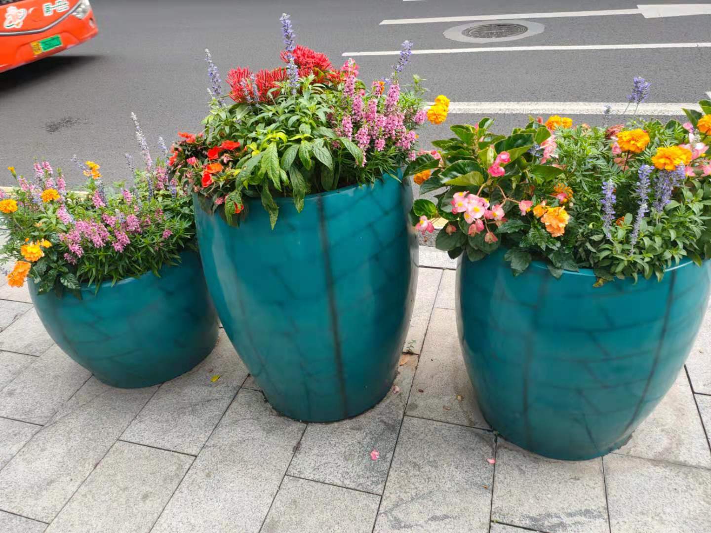 在深圳路邊有三桶花,桶里有指甲花、藍花草,還有許多不知名的花。