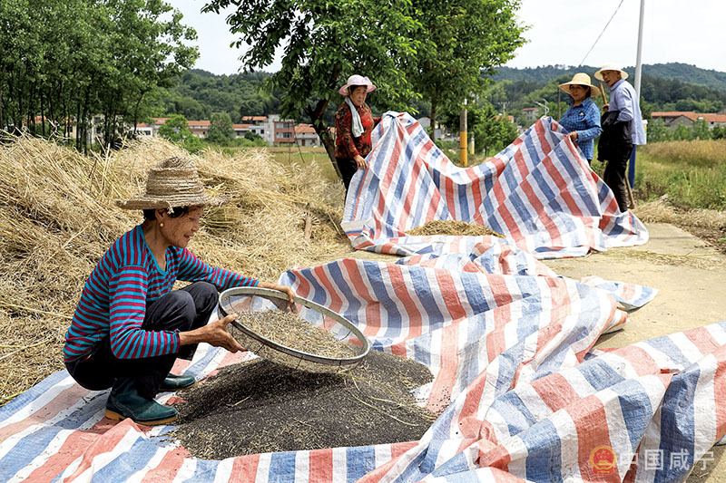5月17日,咸安區高橋鎮村民正搶收油菜籽。咸安區今年收割油菜41.64萬畝,平均每畝可收菜籽約120公斤。
