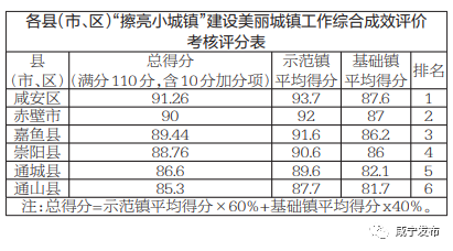 全市各縣(市、區)“擦亮小城鎮”建設美麗城鎮工作綜合評價排名情況為:第一名,咸安區,得分91.26分;第二名,赤壁市,得分90分;第三名,嘉魚縣,得分89.44分;第四名,崇陽縣,得分88.76分;第五名,通城縣,得分86.6;第六名,通山縣,得分85.3分。