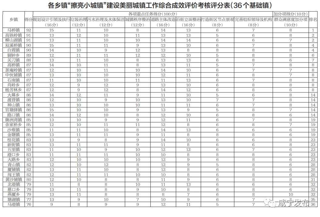 據了解,咸寧全市共有60個農村鄉鎮。啟動“擦亮小城鎮”建設美麗城鎮三年行動以來,全市確定建設24個示范型鄉鎮、36個基礎型鄉鎮。各縣(市、區)此次考核評分由示范鎮平均得分乘以60%加上基礎鎮平均得分乘以40%得出。