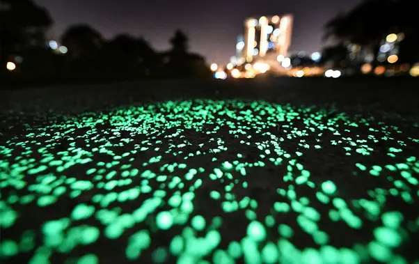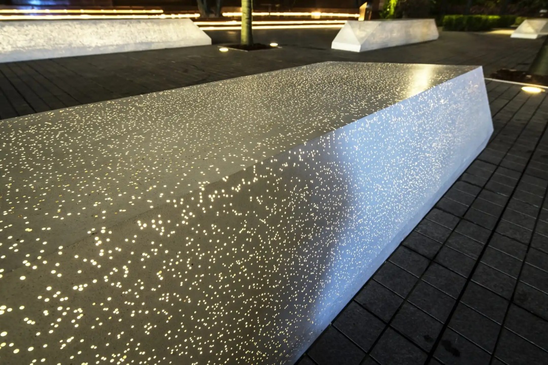 考慮到夜間休閑散步的人多,東入口使用了新型透光混凝土,鋪設自發光步道,搭配氛圍燈帶,營造夜間景觀。