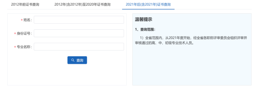 02?根據取得職稱的時間,在頁面下輸入對應的姓名、身份證號及專業即可查詢到職稱電子證書信息。