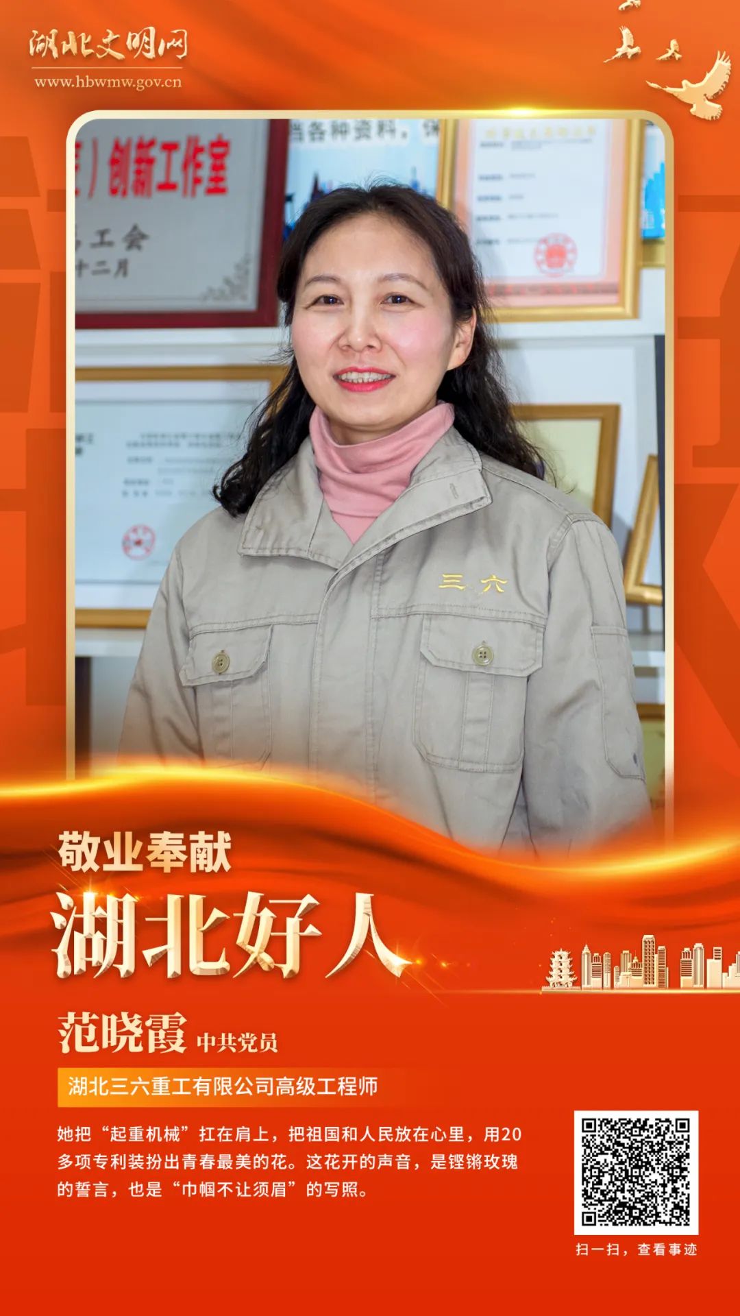 該同志始終踐行工匠精神,多次攻克公司重大技術難題,領銜研發的三項新產品,為公司增加銷售收入2000多萬元。帶領的技術團隊成功研發出國內最大46°爬坡橋梁檢查車,屬國內首創,取得7項專利授權。先后被評為湖北省企業科技創新帶頭人、省楚天技能名師、省企業研發人才、省有突出貢獻中青年專家、省新世紀高層次人才,2020年榮獲全國勞動模范稱號。