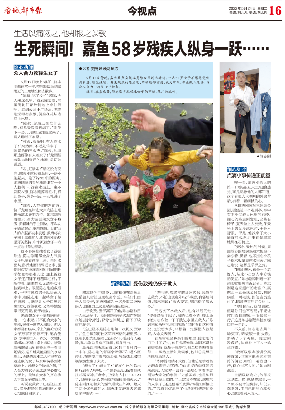 24日,香城都市報報道了嘉魚縣58歲殘疾人陳志剛與眾人一起合力,救助落水女子一事,引起了社會各界的關(guān)注。