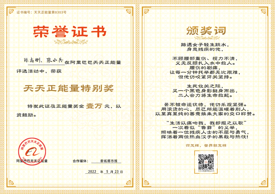 阿里巴巴天天正能量公益項目聯(lián)合香城都市報授予陳志剛和張小兵天天正能量特別獎,并頒發(fā)正能量獎金10000元。