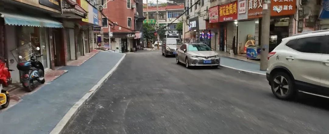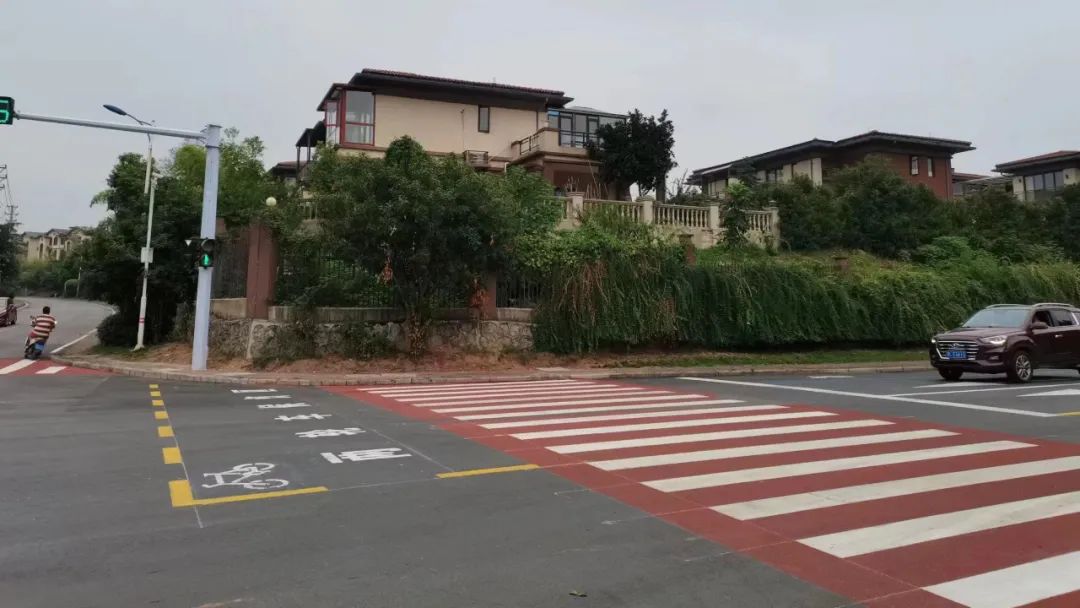 附近的交叉路口,過往是臨時立柱式信號燈,車輛混行易擁堵,如今增設信號燈控,交叉口拓寬,人行橫道采用彩色陶粒罩面,設置兩輪車待行區,規范車輛通行和行人過街,提升通行能力;