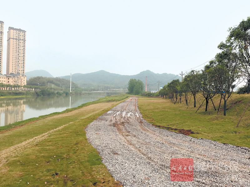 當日上午9時15分,龍潭新橋旁杰士邦地塊,陽光照耀下,鋪設的草皮鮮綠,新栽的苗木舒展,一條碎石子路,沿著淦河蜿蜒。
