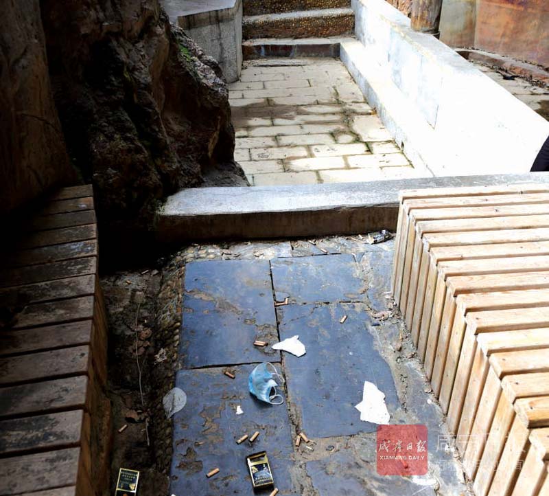 一個泡池里,到處都是煙頭、紙屑、枯葉;另外一個泡池里,有煙盒、口罩、塑料瓶、破碎塑料等垃圾;一個角落里,長滿了黑綠色的青苔,上面有個腐爛看不出原形的水果。