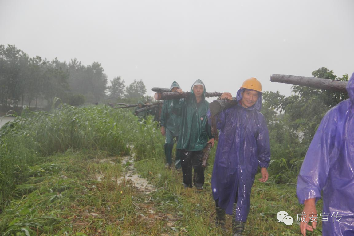 緊急搬運防汛木料。見到有人拍照,搶險隊員靦腆的笑了。