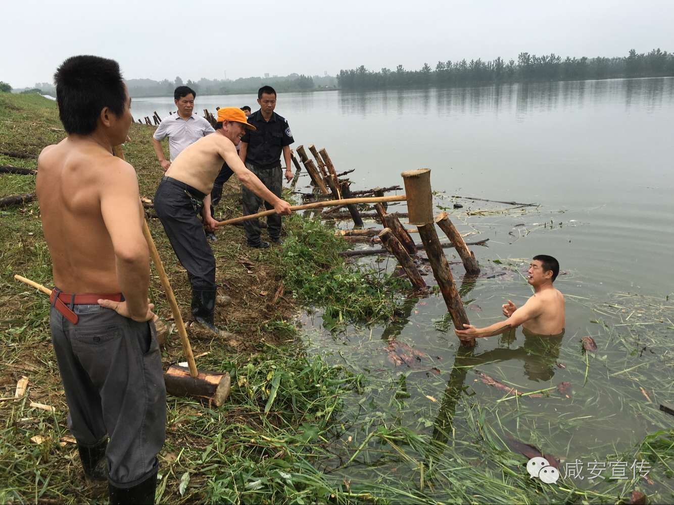 因為手被震麻,搶險隊員輪流打樁,加固提防。