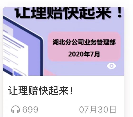 02 本周賠案之最 本周,湖北多地高溫預警,但都沒有阻擋理賠人的步伐。大家冒著酷暑,創記錄地在一周內為28位客戶送去重疾先賠服務。 貼心、便捷的理賠贏得客戶信任與贊嘆! 本周重疾先賠結案最高 十堰Y女士在2012年購買《健康人生終身重大疾病保險》。7月底確診甲狀腺惡性腫瘤,代理人第一時間為客戶報案,想為客戶申請重疾先賠服務。 十堰調查員陳濤立即與代理人取得聯系,用微信在線指導她準備理賠資料,提示保單紅利領取等理賠事宜。 8月3日下午17:52,Y女士資料準備齊全,調查員用移動調查設備為客戶申請重疾理賠。 公司加班加點快速審核,在當晚20:35結案,賠付客戶19萬元重疾保險金,從申請到結案只耗時2小時。 助力金泰 理賠在行動! 金泰正酣,業務伙伴全力奮戰在一線的同時,理賠伙伴也不甘示弱——全力用專業的理賠服務對公司業務展開支持,為金泰杯添磚加瓦! 理賠支持服務方案 湖北理賠積極對接“精英代理人支持方案”以及“代理人理賠支持方案”。 同時面向業務伙伴制作“理賠服務支持方案”內容介紹宣傳長圖,方便伙伴們對方案進行更深入的理解! 賦能一線培訓宣導 線下宣導 本周《理賠知多少》宣導持續進行,現場火爆依舊。通過理賠伙伴積極的帶動,截止周五,湖北分公司共完成理賠宣導99場,覆蓋4064人次和所有四級機構,本期的理賠宣導圓滿完成! 線上宣導 為方便伙伴們隨時對理賠知識進行查漏補缺,分公司也制作了視頻版本《讓理賠快起來!》宣導課件。現視頻播放量已達699,宣傳效果顯著! 業管理賠定將繼續 用心服務,提升時效, 乘風破浪,助力金泰, 支持公司業務全面正增長!