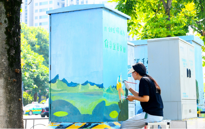 9月8日,湖北科技學院藝術與設計學院學生在銀泉大道變電箱上進行手繪,原本空白單調的變電箱體“穿”上美麗的新衣,成為微景觀。