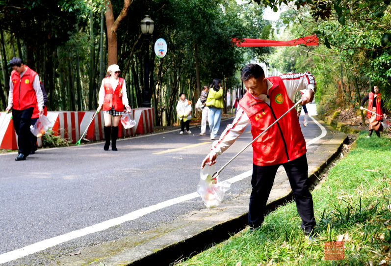 2月19日,潛山國家森林公園,來自市義工協(xié)會的成員們正沿路撿拾垃圾。