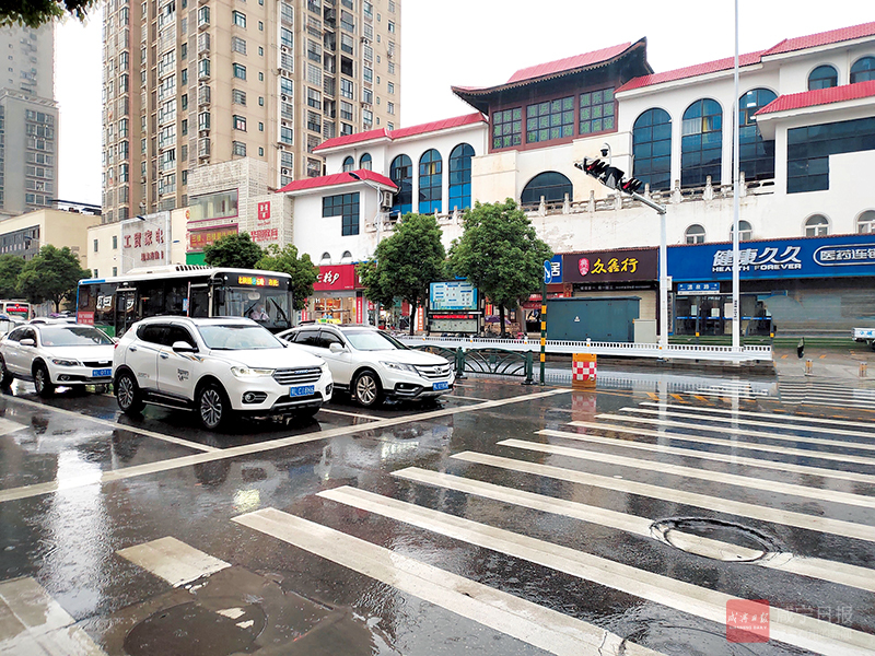 時值雨天,路面濕滑,絕大部分車輛都能夠減速慢行,禮讓斑馬線上的行人,耐心等待著綠燈的轉變。