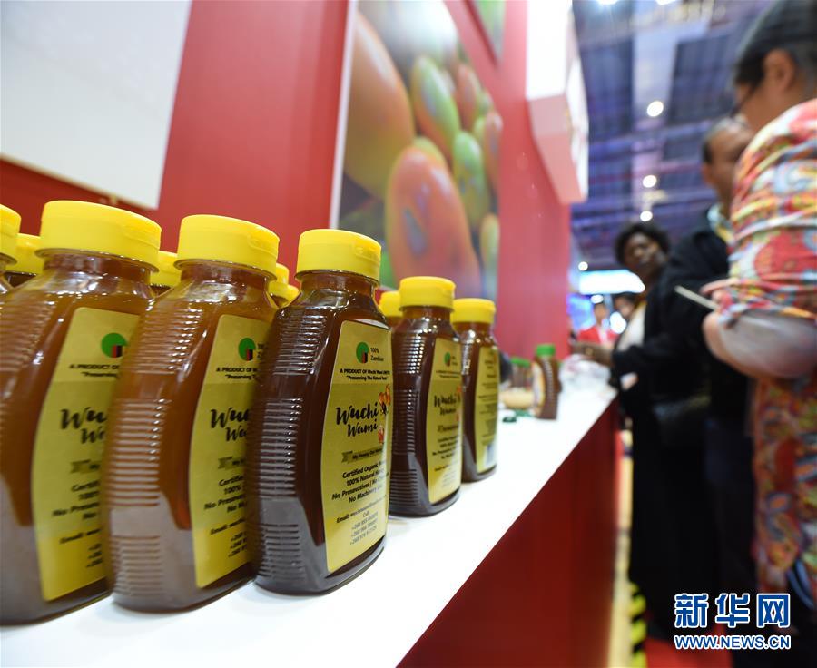11月6日,在上海舉行的第二屆中國國際進口博覽會上,人們了解贊比亞蜂蜜。 新華社記者 尹炣 攝