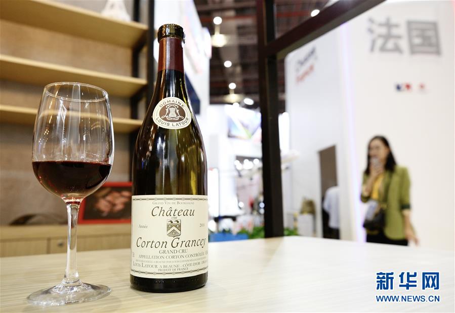 11月5日在第二屆進博會法國國家館拍攝的法國路易拉圖科爾登-格蘭塞干紅葡萄酒。 新華社記者 張玉薇 攝