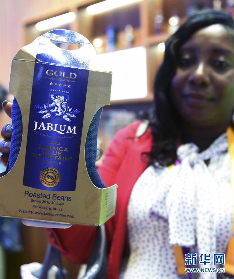 11月6日,在第二屆進博會牙買加國家館,參展商展示藍山咖啡產品。新華社記者 范培珅 攝