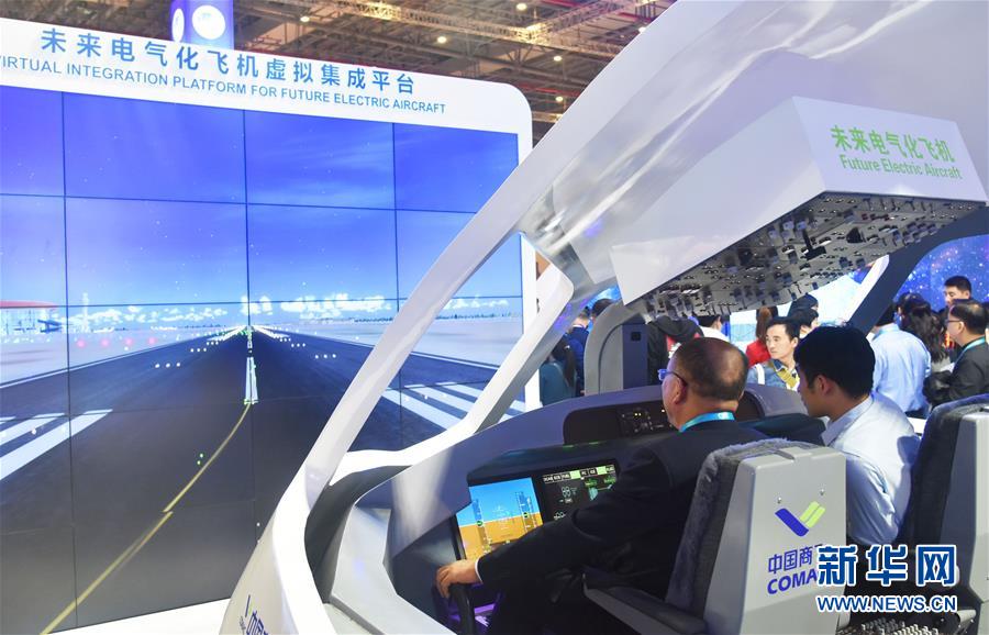 11月6日,在第二屆進博會中國館“創新中國”單元的未來電氣化飛機虛擬集成平臺,觀眾在體驗中國商飛大型客機模擬駕駛艙操作。 新華社記者 魏海 攝
