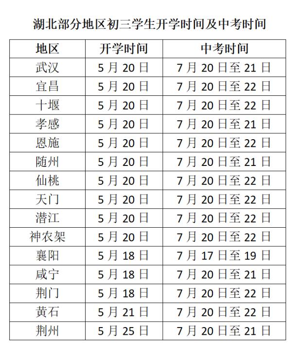 從各地發布的通告看,襄陽、咸寧、荊門三地的初三年級開學時間最早,均為5月18日。武漢、宜昌、十堰、孝感、恩施、隨州、仙桃、潛江、天門、神農架等十地的開學時間均為5月20日。黃石市5月21日開學。荊州市開學時間最晚,為5月25日。