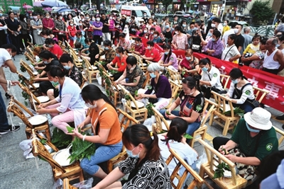 隨著比賽的深入,現場戰況也越來越激烈。他們中有鄰里同競技,有妯娌同臺秀,有祖孫同比拼……大家你追我趕互不相讓,旁邊還有親友團在一旁鼓勁加油,一幅幅和諧、溫暖的畫面,不時打動著圍觀群眾。“我們比拼一下,圖個熱鬧。”55歲選手巫細云告訴記者,她們小區來了7個人,都是多年的老鄰居,這次聚在一起參加包粽比賽,主要是為了增進鄰里情。