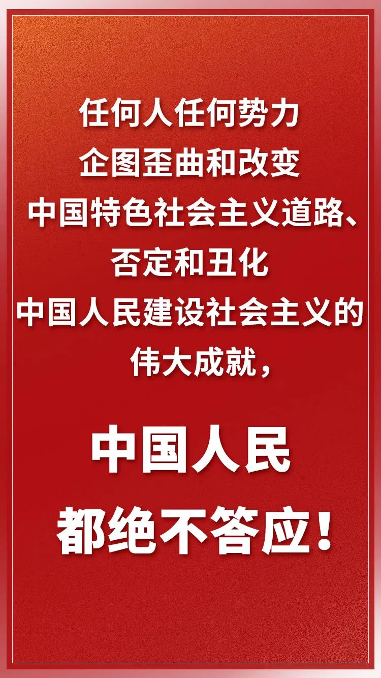 ——實現(xiàn)中華民族偉大復(fù)興,必須堅持走中國特色社會主義道路。道路問題直接關(guān)系黨和人民事業(yè)興衰成敗。中國特色社會主義道路是黨和人民歷經(jīng)千辛萬苦、克服千難萬險取得的寶貴成果。中國特色社會主義道路,開拓于中國人民共同奮斗,扎根于中華大地,是給中國人民帶來幸福安寧的正確道路。無論遇到什么風(fēng)浪,在堅持中國特色社會主義道路這個根本問題上都要一以貫之,決不因各種雜音噪音而改弦更張。隨著新時代堅持和發(fā)展中國特色社會主義的偉大實踐不斷向前,我們的道路必將越走越寬廣,我們的制度必將越來越成熟。任何人任何勢力企圖歪曲和改變中國特色社會主義道路、否定和丑化中國人民建設(shè)社會主義的偉大成就,中國人民都絕不答應(yīng)!