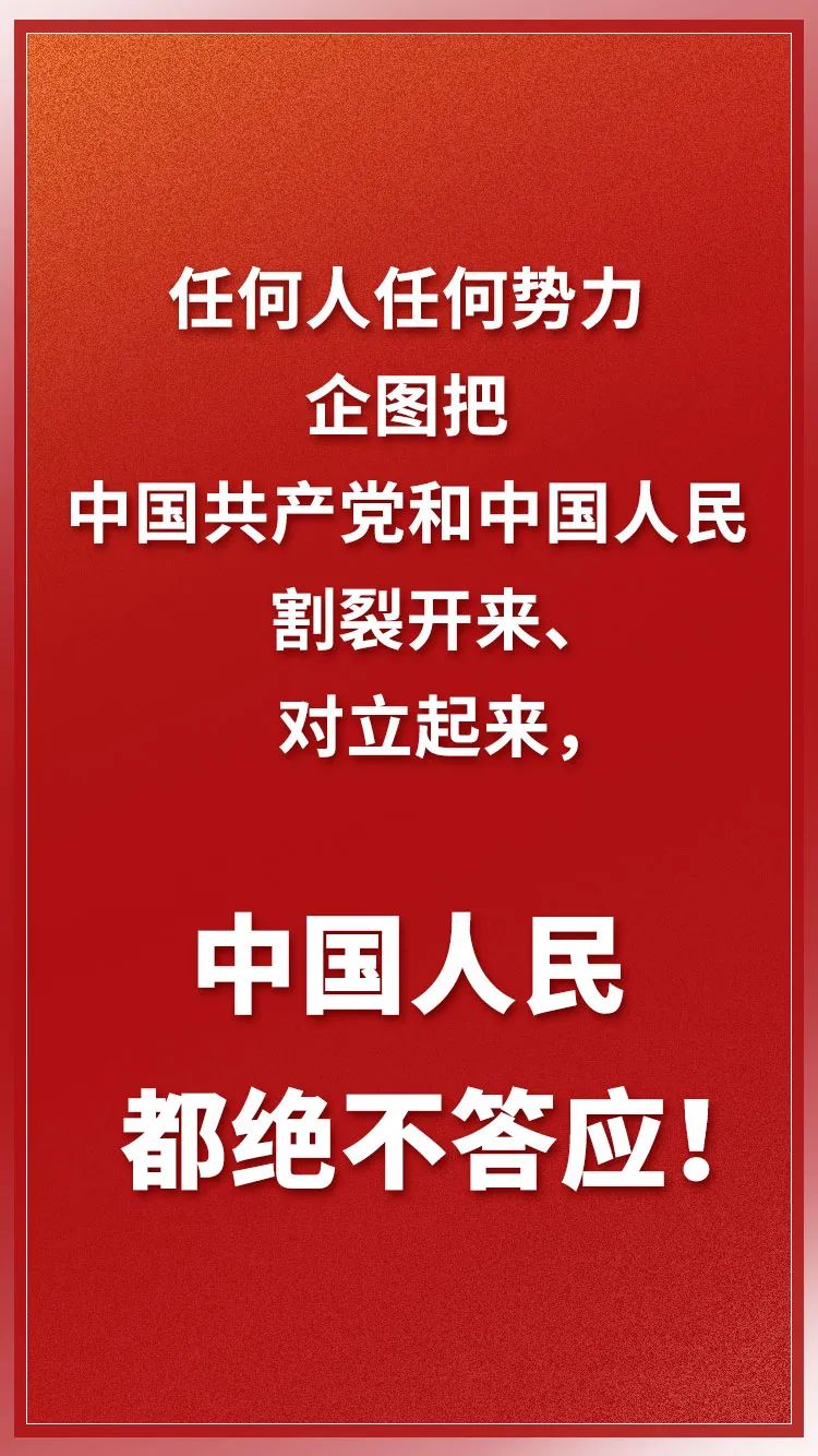 ——實現(xiàn)中華民族偉大復(fù)興,必須堅持以人民為中心。人民是歷史的創(chuàng)造者,是決定黨和國家前途命運的根本力量。中國共產(chǎn)黨來自人民、植根人民,初心和使命是為中國人民謀幸福、為中華民族謀復(fù)興,根本宗旨是全心全意為人民服務(wù)。我們要堅持一切為了人民、一切依靠人民,保持同人民的血肉聯(lián)系,緊緊依靠人民開拓事業(yè)新局面,促進全體人民共同富裕。任何人任何勢力企圖把中國共產(chǎn)黨和中國人民割裂開來、對立起來,中國人民都絕不答應(yīng)!