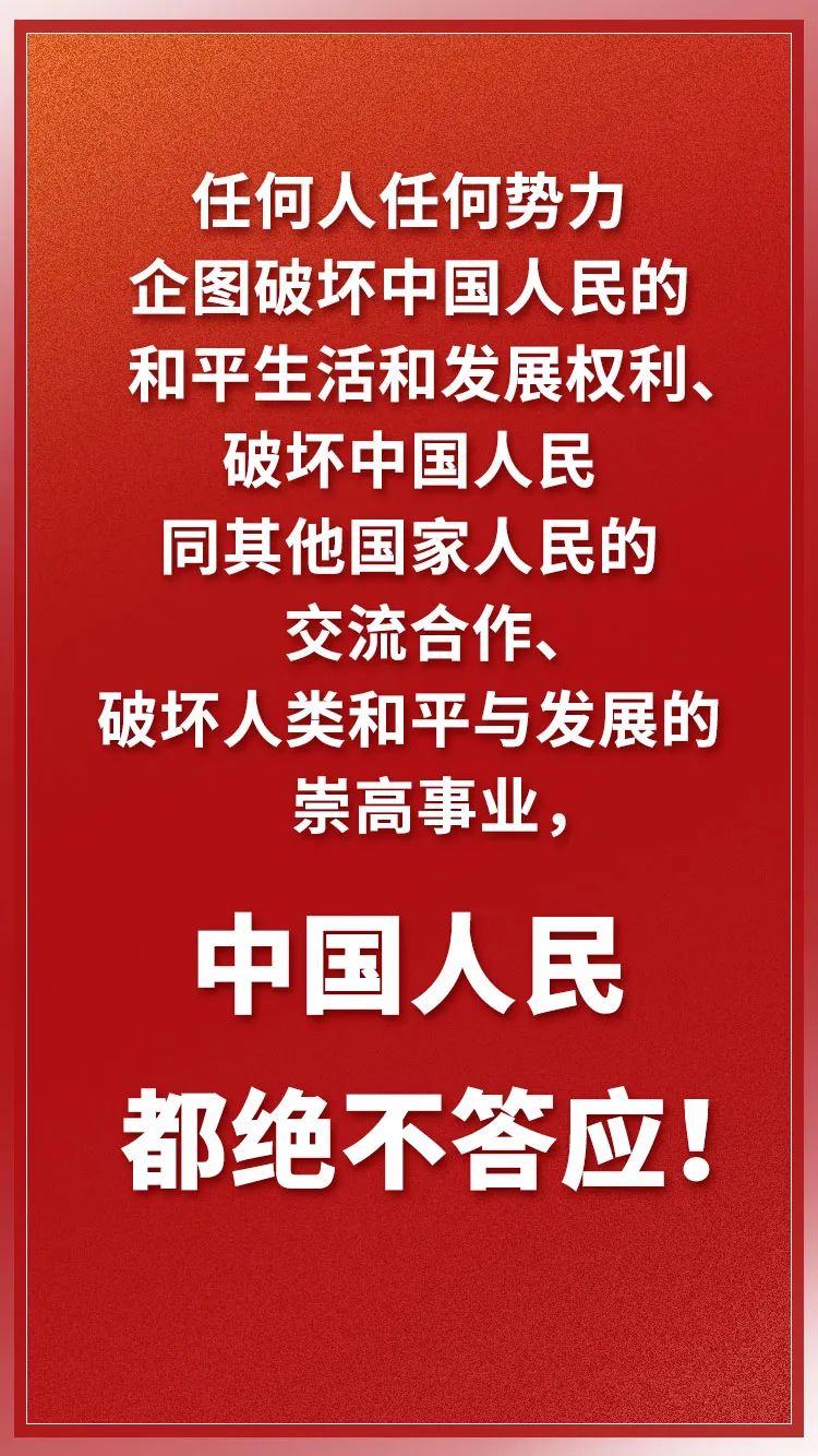 ——實現(xiàn)中華民族偉大復(fù)興,必須堅定不移走和平發(fā)展道路。近代以后,中國人民遭受列強的侵略、凌辱、掠奪達百年以上,但中國人民不是從中學(xué)到弱肉強食的強盜邏輯,而是更加堅定了維護和平的決心。人類命運休戚與共,各國人民應(yīng)該秉持“天下一家”理念,共同推動構(gòu)建人類命運共同體。中國人民熱愛和平、珍惜和平,把維護世界和平、反對霸權(quán)主義和強權(quán)政治作為自己的神圣職責(zé),堅決反對動輒使用武力或以武力威脅處理國際爭端,堅決反對打著所謂“民主”、“自由”、“人權(quán)”等幌子肆意干涉別國內(nèi)政。中國人民將一如既往同各國人民攜手努力,為創(chuàng)造人類美好未來而不懈奮斗。任何人任何勢力企圖破壞中國人民的和平生活和發(fā)展權(quán)利、破壞中國人民同其他國家人民的交流合作、破壞人類和平與發(fā)展的崇高事業(yè),中國人民都絕不答應(yīng)!