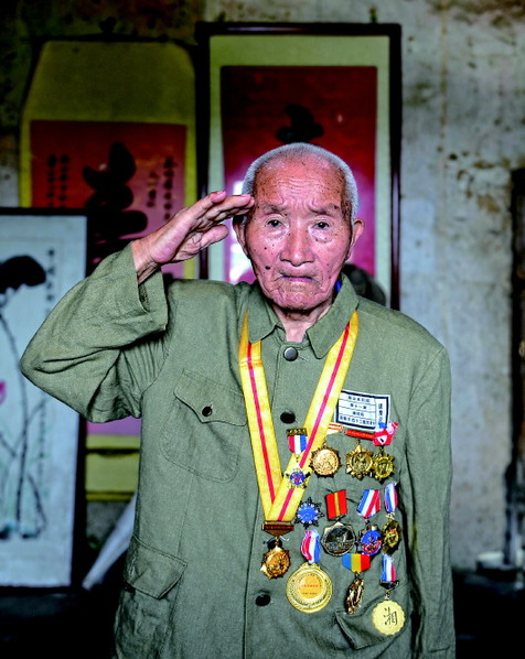在盧慶貽臥房里,墻上掛著很多他參加抗戰紀念活動的照片,桌上擺著各種榮譽和紀念勛章。“跟那些犧牲的戰友相比,我算幸運的。無數將士官兵獻出寶貴生命,才換來如今的和平生活。”盧老說,“我們要珍惜和平,希望永遠不要再有戰爭。”