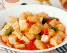 老豆腐 1塊 青椒 半個 菠蘿 ?個 紅椒 半個 白醋 1勺 糖 半勺 淀粉 1勺 番茄醬 2勺 鹽 適量