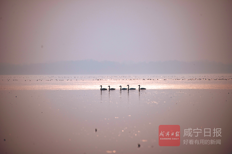 冬日西涼湖,夕陽西下,波光粼粼。在嘉魚渡普水域,飛越千山萬水來此越冬棲息的數千只天鵝和大雁,一會兒在湖面追逐嬉戲,一會兒展翅翱翔。岸邊,成群的野鴨和水鳥望著這些既熟悉又陌生的遠方來客,“嘎嘎”地叫個不停……